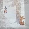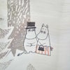 上質感のある繊細な描写の木々の近くでムーミンとたくさんの仲間たちが見え隠れする可愛らしいデザイン